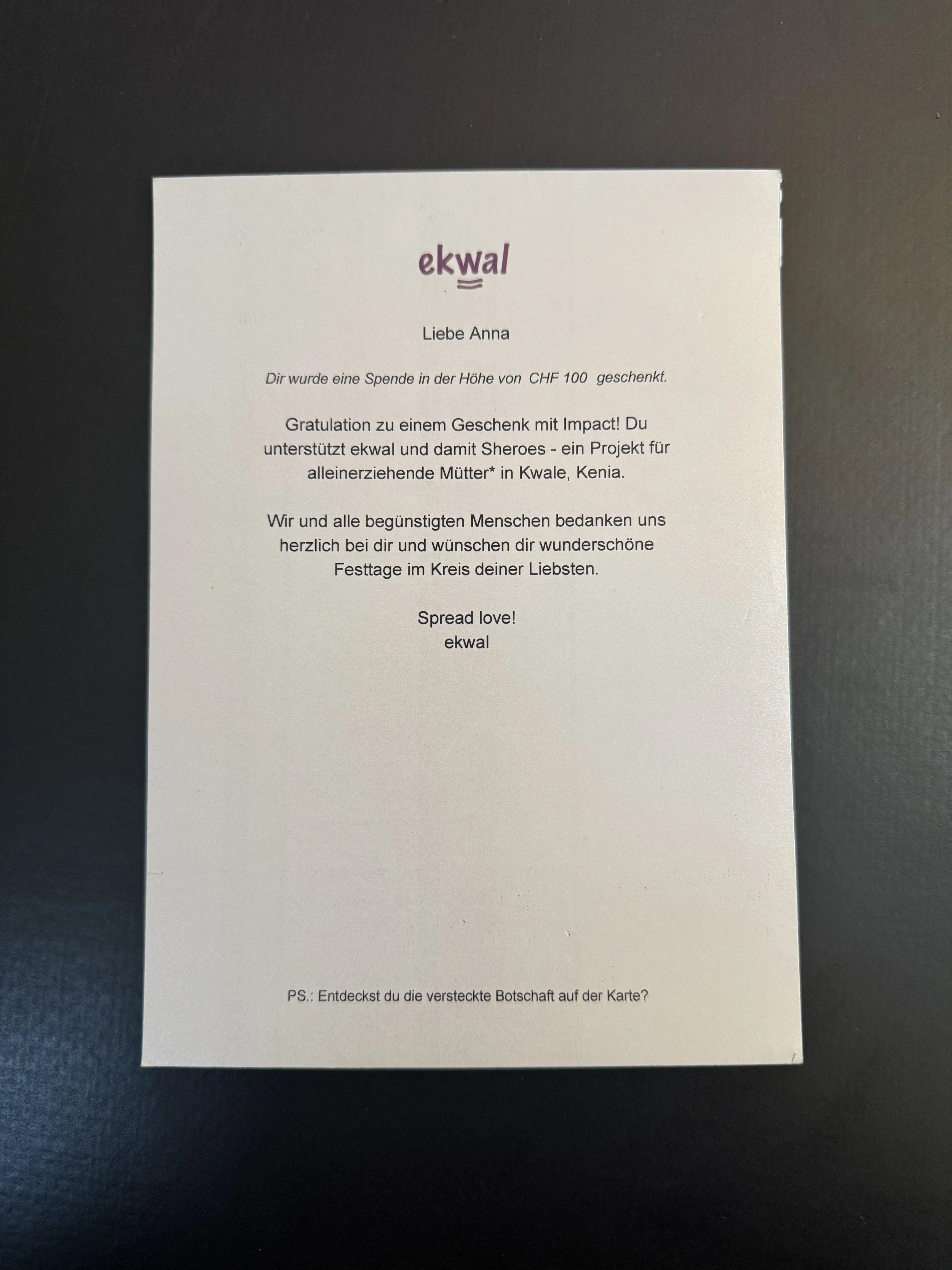 Mit dem Kauf des Artikels im Online-Shop erhältst du eine Karte mit dem Spendenbetrag und einem Grusstext, welchen du der beschenkten Person überreichen kannst.